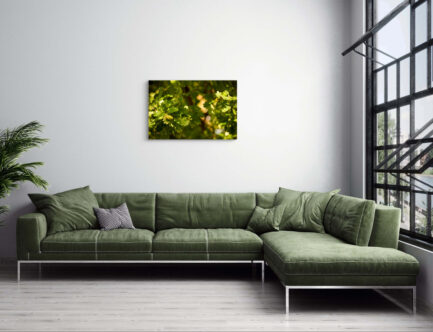 Dieses Fine Art Foto zeigt die Vielfalt und Kraft der Natur im Detail. Im Mittelpunkt stehen das satte Grün der Eichenblätter und eine junge Eichel. Sonnenstrahlen brechen durch das Blätterdach und erzeugen ein warmes, lebendiges Lichtspiel. Kleine Tropfen auf den Blättern lassen die Szene frisch und kraftvoll wirken. Die Komposition lenkt den Blick auf das Wesentliche und lädt ein, die Feinheiten der Natur neu zu entdecken. Die vielen Grüntöne schaffen eine Atmosphäre von Ruhe und Erholung.