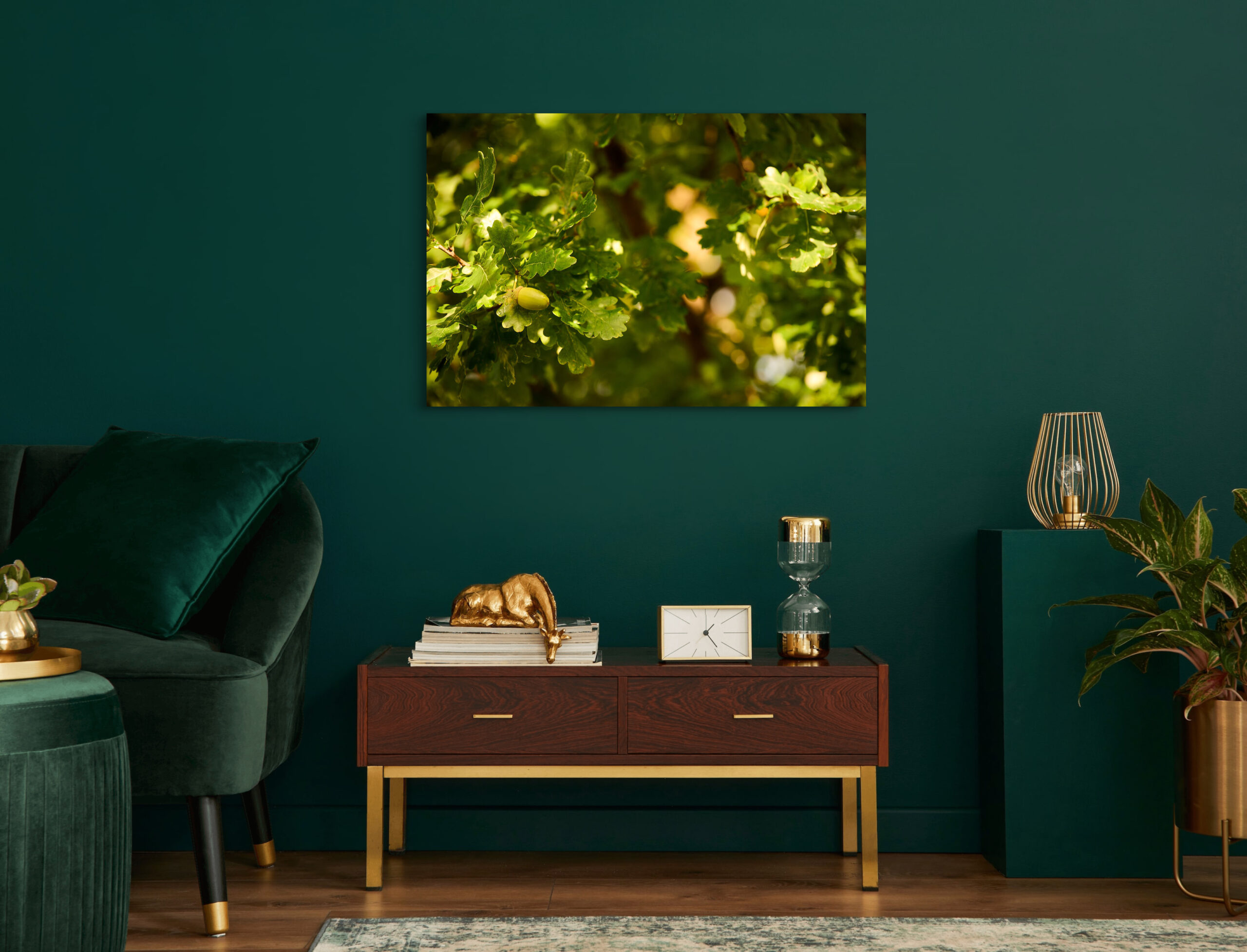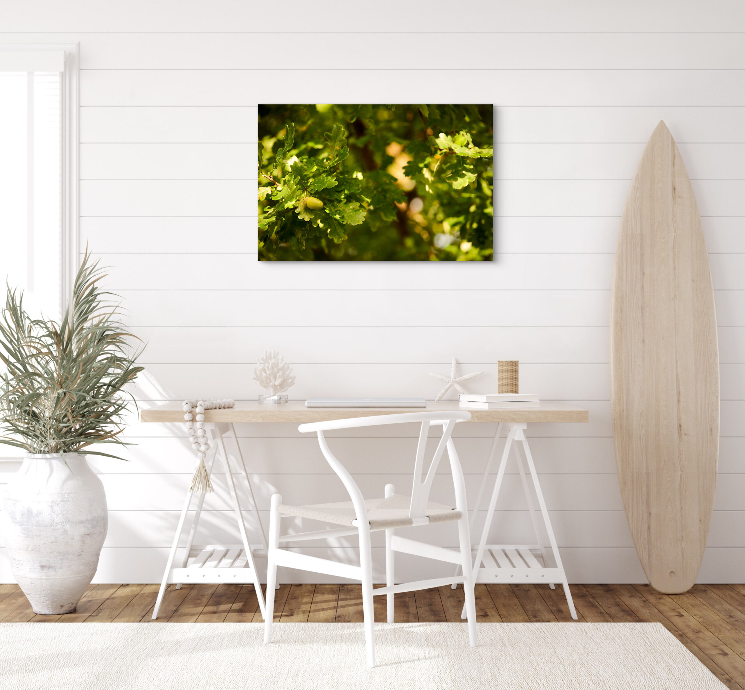 Dieses Werk erinnert an Spaziergänge im Wald und die Energie, die uns die Natur schenkt. Jeder Blick darauf wirkt beruhigend und gleichzeitig belebend. Es eignet sich ideal, um Wohnräumen Frische und Natürlichkeit zu verleihen. In Büros unterstützt es Konzentration und bringt eine angenehme, inspirierende Stimmung. Auf hochwertigem Fine Art Papier gedruckt erscheinen Farben und Details besonders intensiv. Jedes Blatt, jede Kontur der Eichel wird präzise sichtbar. Dieses Kunstwerk bringt die Schönheit und Lebenskraft des Waldes direkt nach Hause.