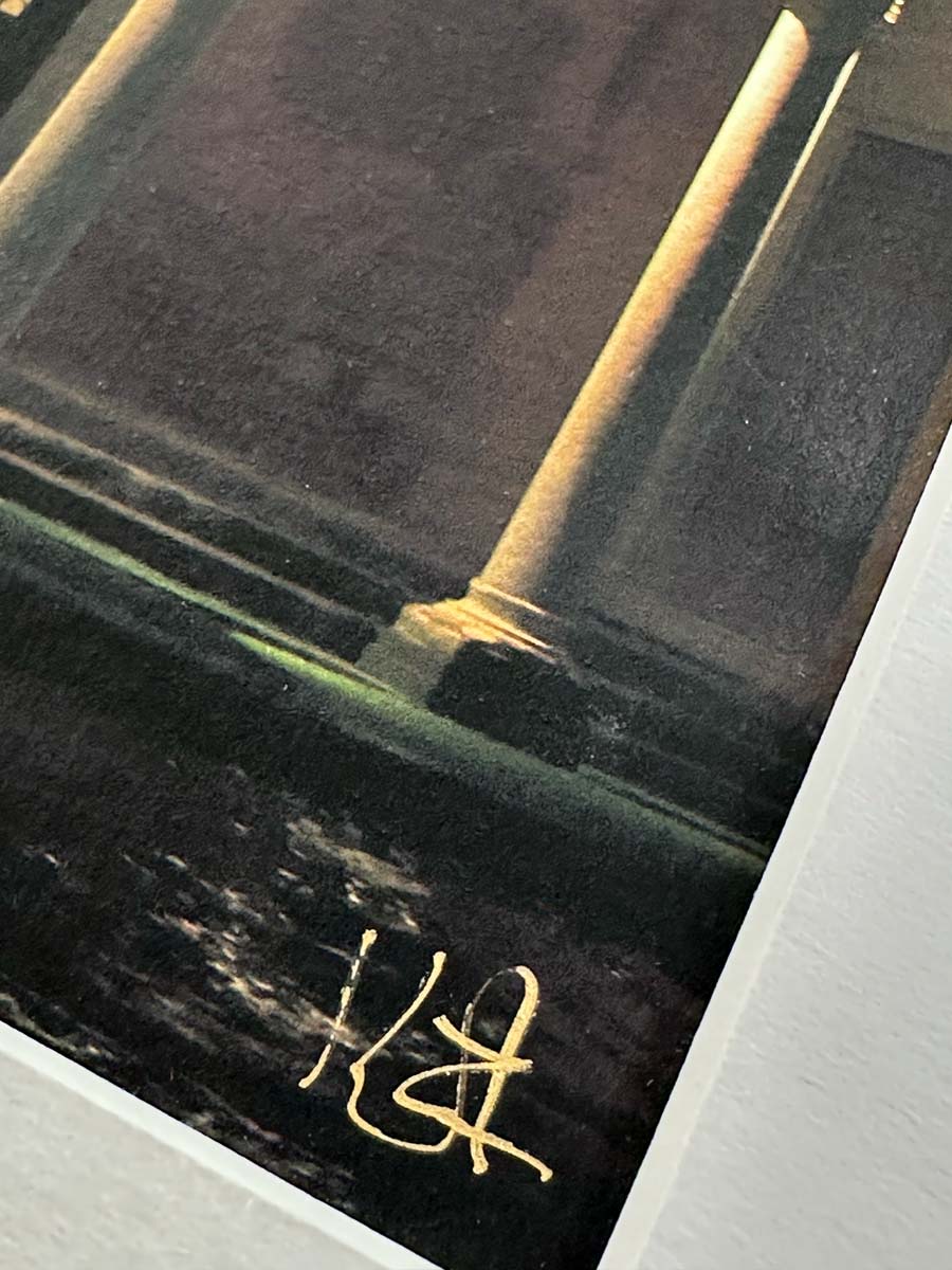 Das weiche, diffuse Licht akzentuiert die Struktur der Säulen und verstärkt die Dramatik des Spiels zwischen Licht und Schatten. Die Reflexionen im Wasser schaffen eine subtile Verbindung zwischen der Architektur und den Kanälen, die Venedig so einzigartig machen. Der Druck auf Hahnemühle Sugar Cane Papier verleiht dem Werk eine besonders edle Note und hebt die feinen Details der Fotografie hervor.