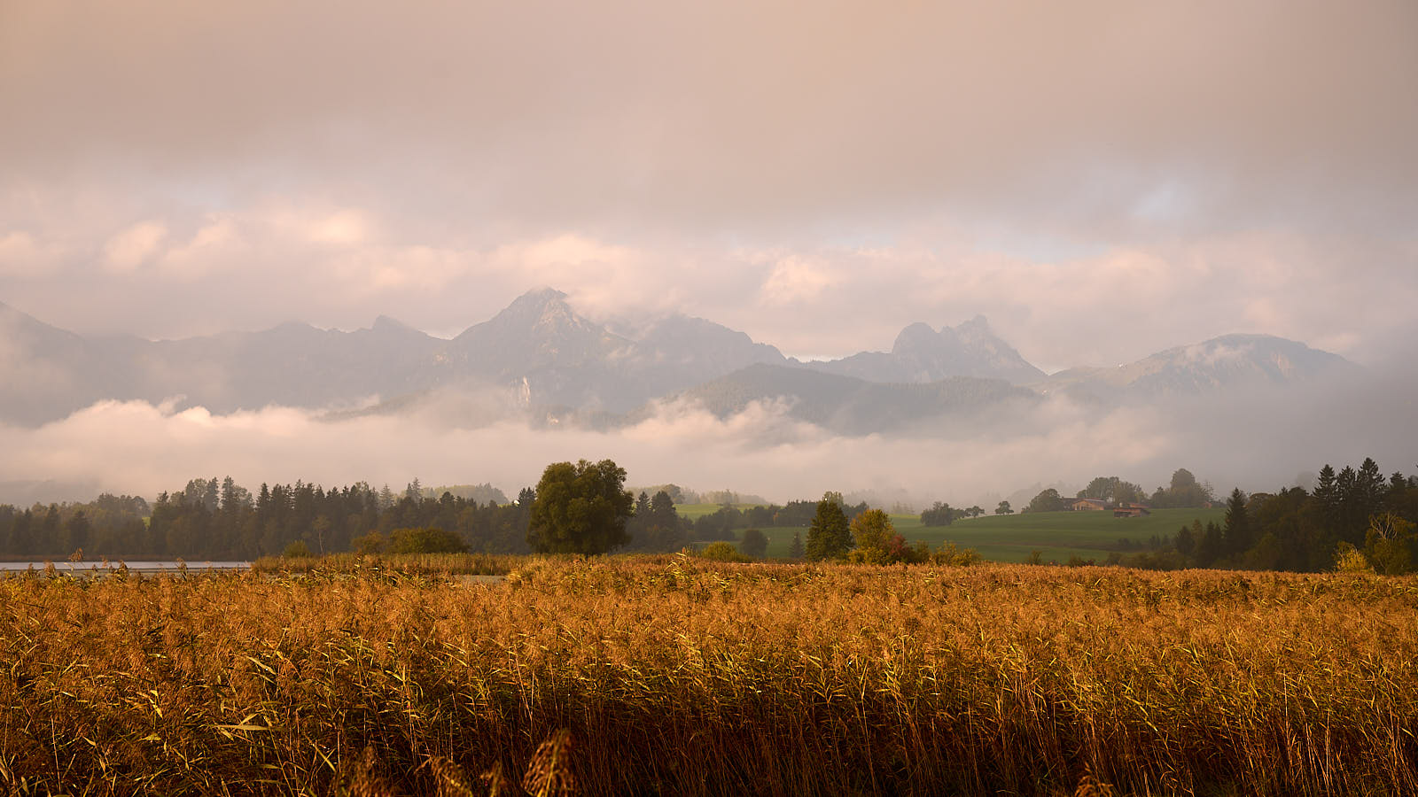 Hinter dem Feld erstrecken sich Wälder und sanfte Hügel, die langsam im Morgenlicht erwachen. Darüber ragen die Berge des Allgäus auf, teilweise verhüllt von dichten Nebelschwaden. Wolken und Nebel spielen zusammen und erzeugen ein geheimnisvolles, fast malerisches Panorama.