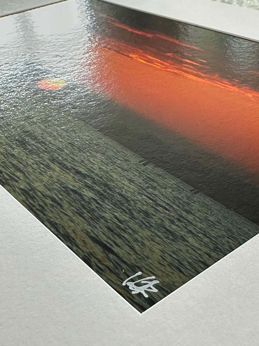 Jedes Detail des Himmels und des Wassers wurde sorgfältig eingefangen, sodass der Moment voller Emotionen und Farben lebendig bleibt. Gedruckt auf hochwertigem Hahnemühle Bamboo Gloss Baryta 305 Papier, einem besonderen Papier, das zu 90 % aus nachhaltigen Bambusfasern besteht und eine feine Glanzoberfläche bietet. Dieses Papier verstärkt die warmen Farbtöne und die Tiefe des Bildes und gibt dem Werk eine beeindruckende Brillanz. Die Hahnemühle Bamboo Gloss Baryta 305 ist nicht nur umweltfreundlich, sondern bringt auch die zarten Details und Farbnuancen perfekt zur Geltung, die der Künstler mit Hingabe in dieses Werk eingefügt hat. Das Bild ist nicht nur eine Erinnerung an Venedig, sondern auch eine Einladung, sich in die Weite und Ruhe der Natur zu vertiefen.